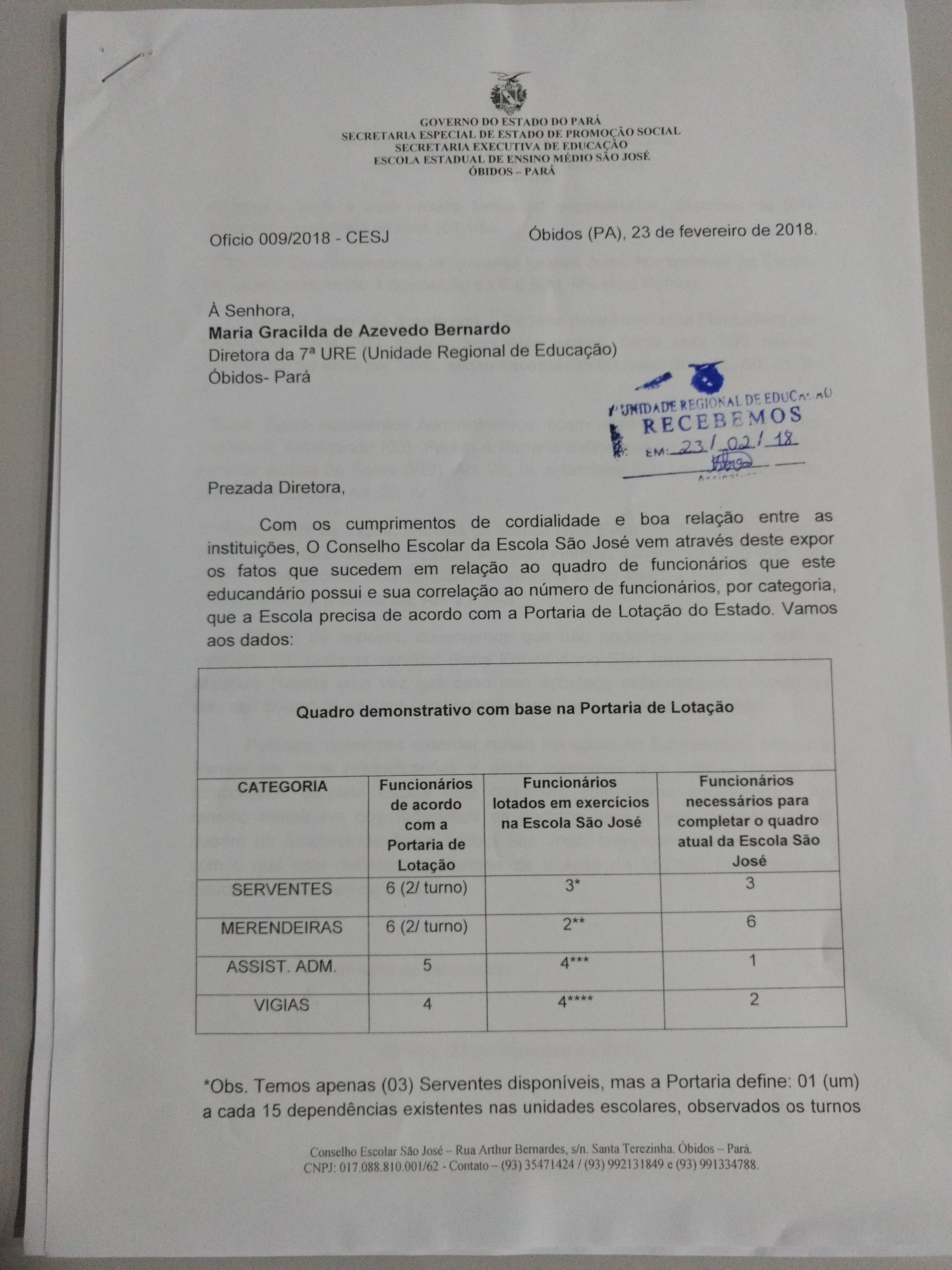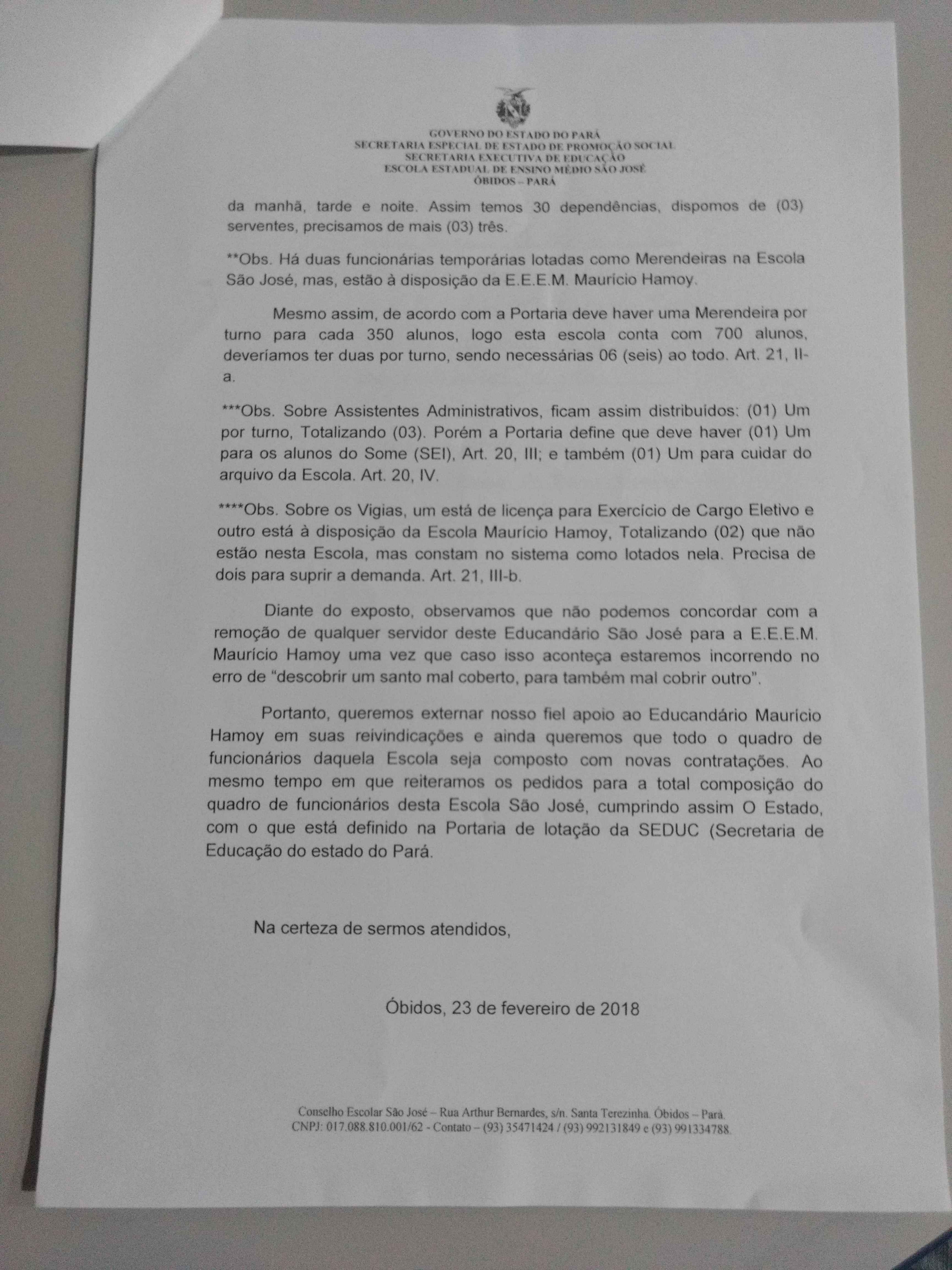 Além disso, o referido Conselho declara apoio às reivindicações da Maurício Hamoy ao mesmo tempo em que reiterou o pedido para que o Estado cumpra a Portaria de Lotação que consta no site da SEDUC que define o número de funcionários de apoio de acordo com o número de alunos e dependências das Escolas Estaduais. Veja o documento anexo.